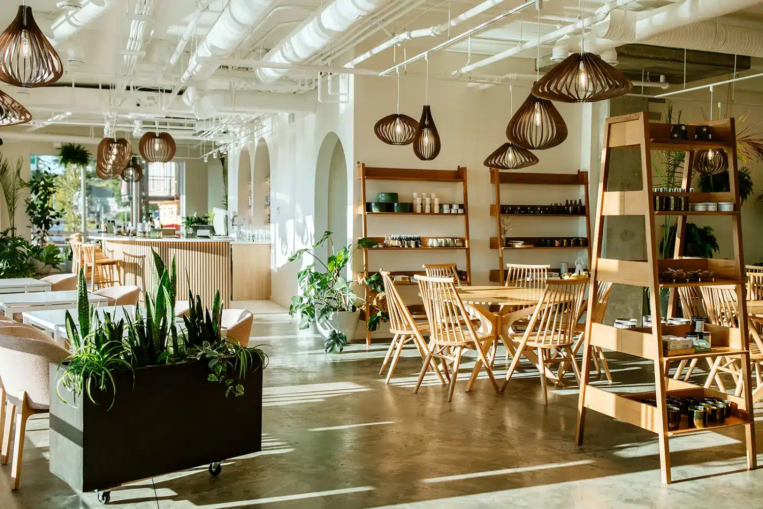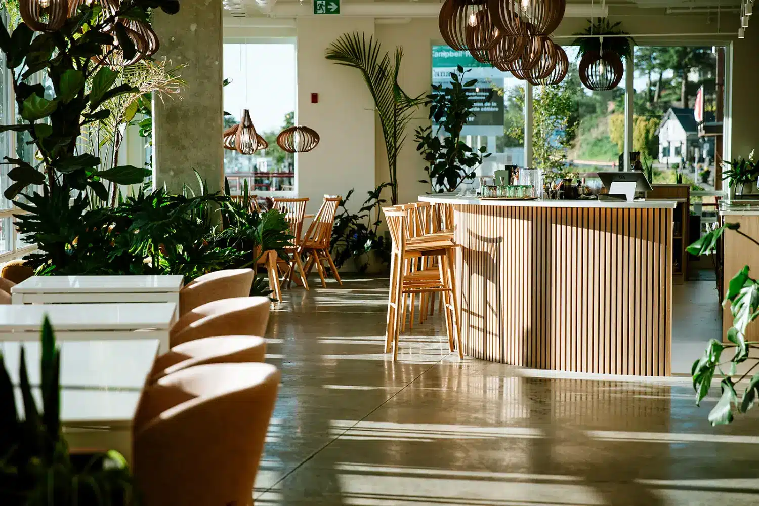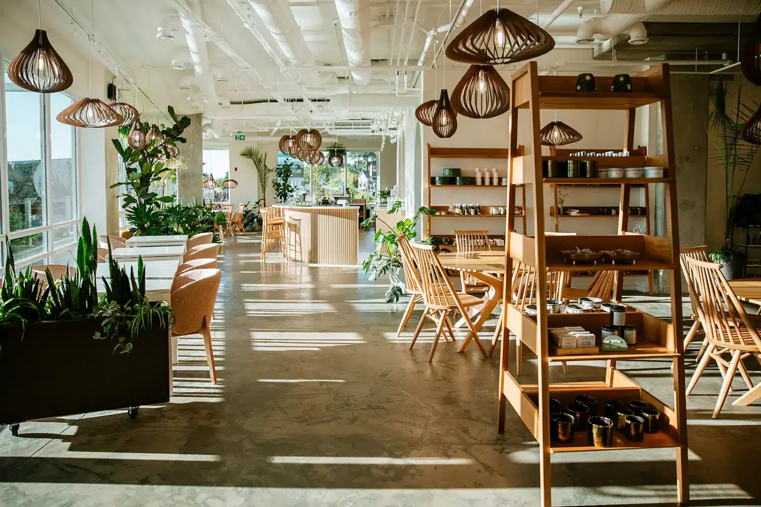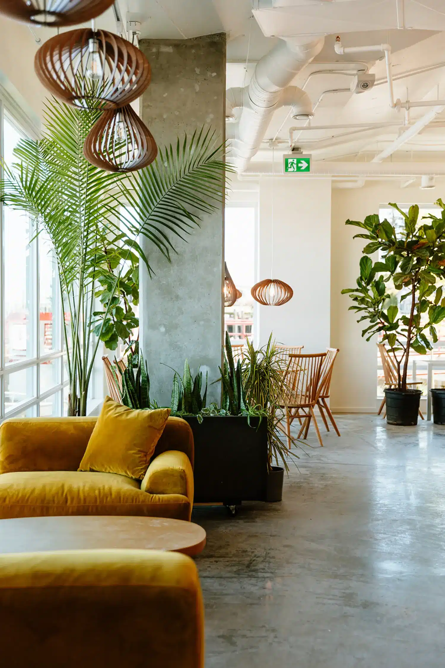 This space features a modern, biophilic design with abundant natural light, wooden furniture, and greenery. The open layout creates a welcoming ambiance, while warm lighting and natural textures promote relaxation. The use of plants adds vitality, blending functionality with aesthetics.