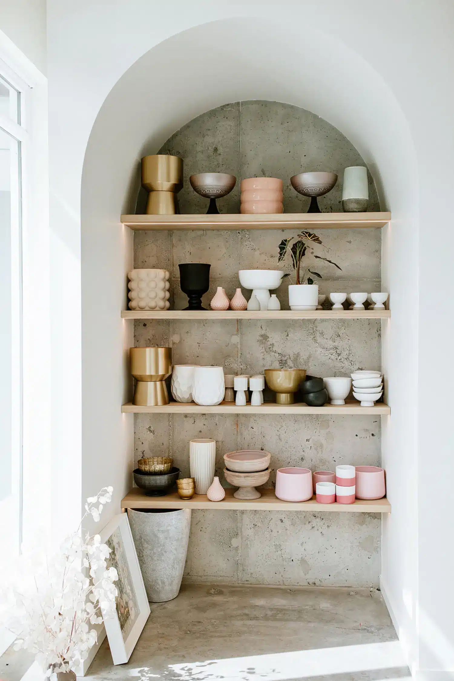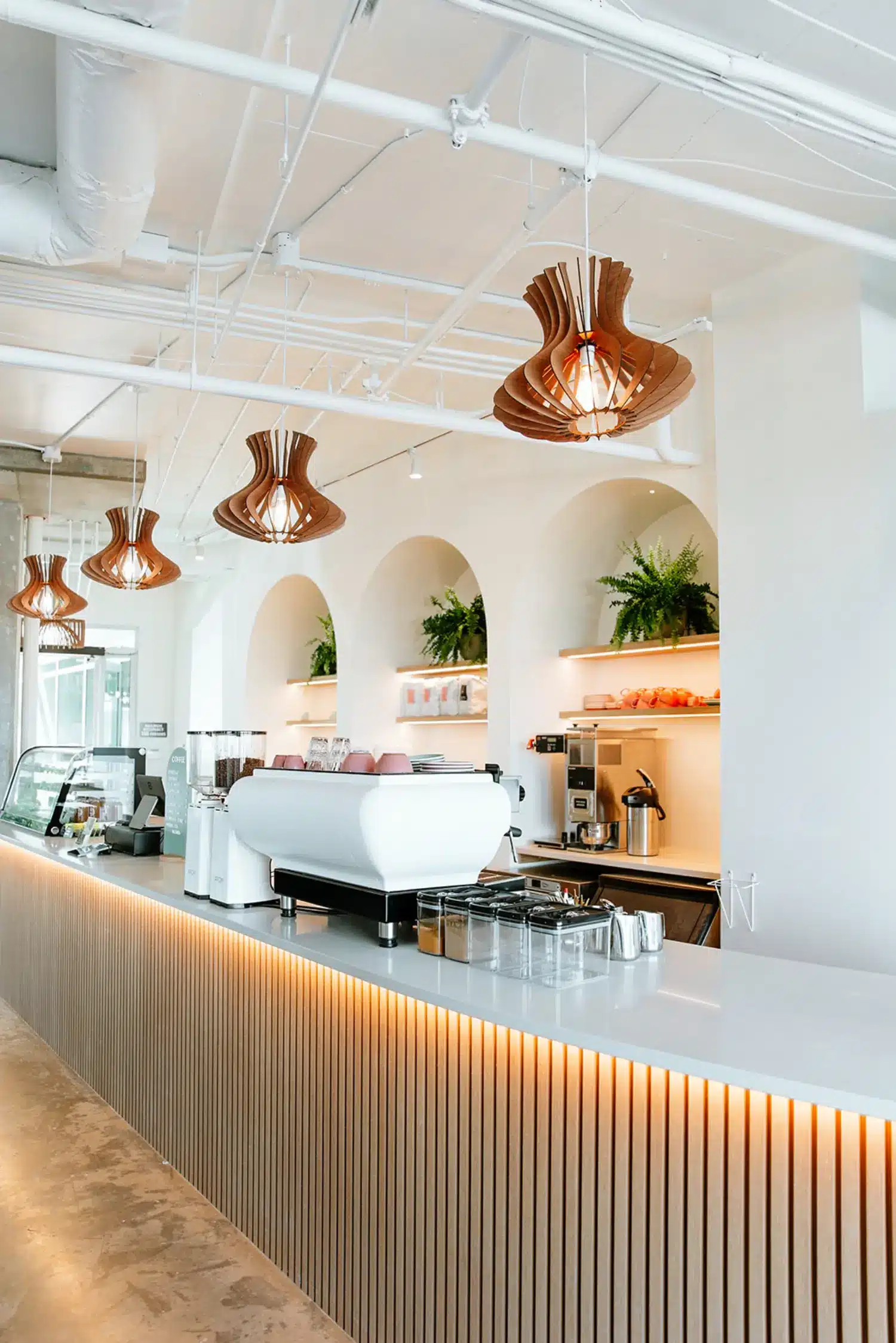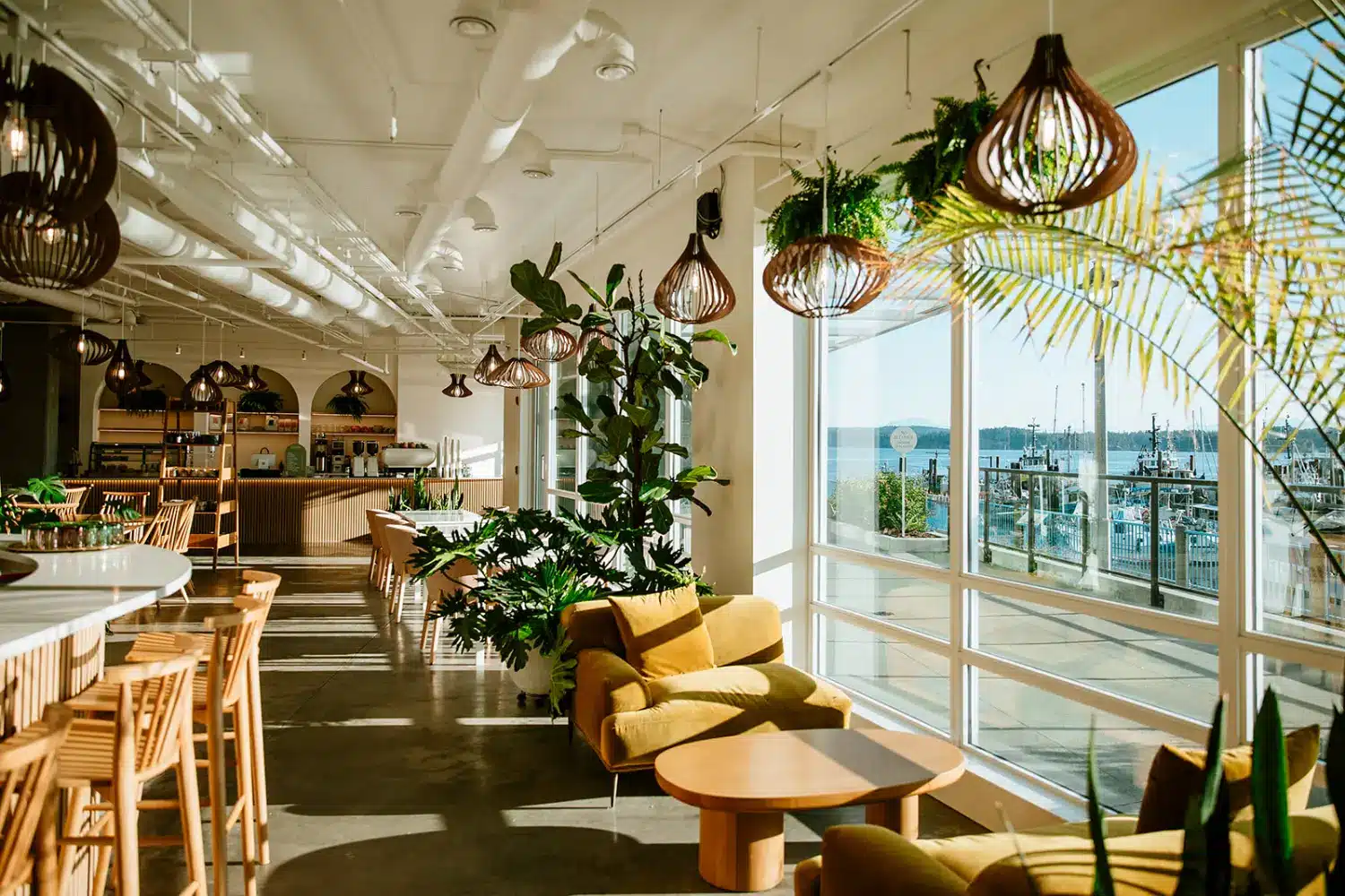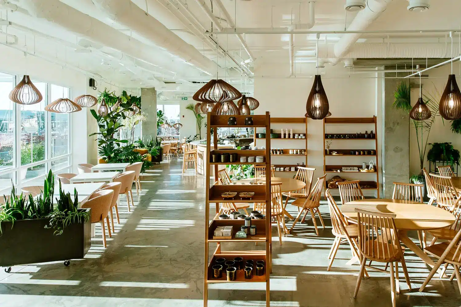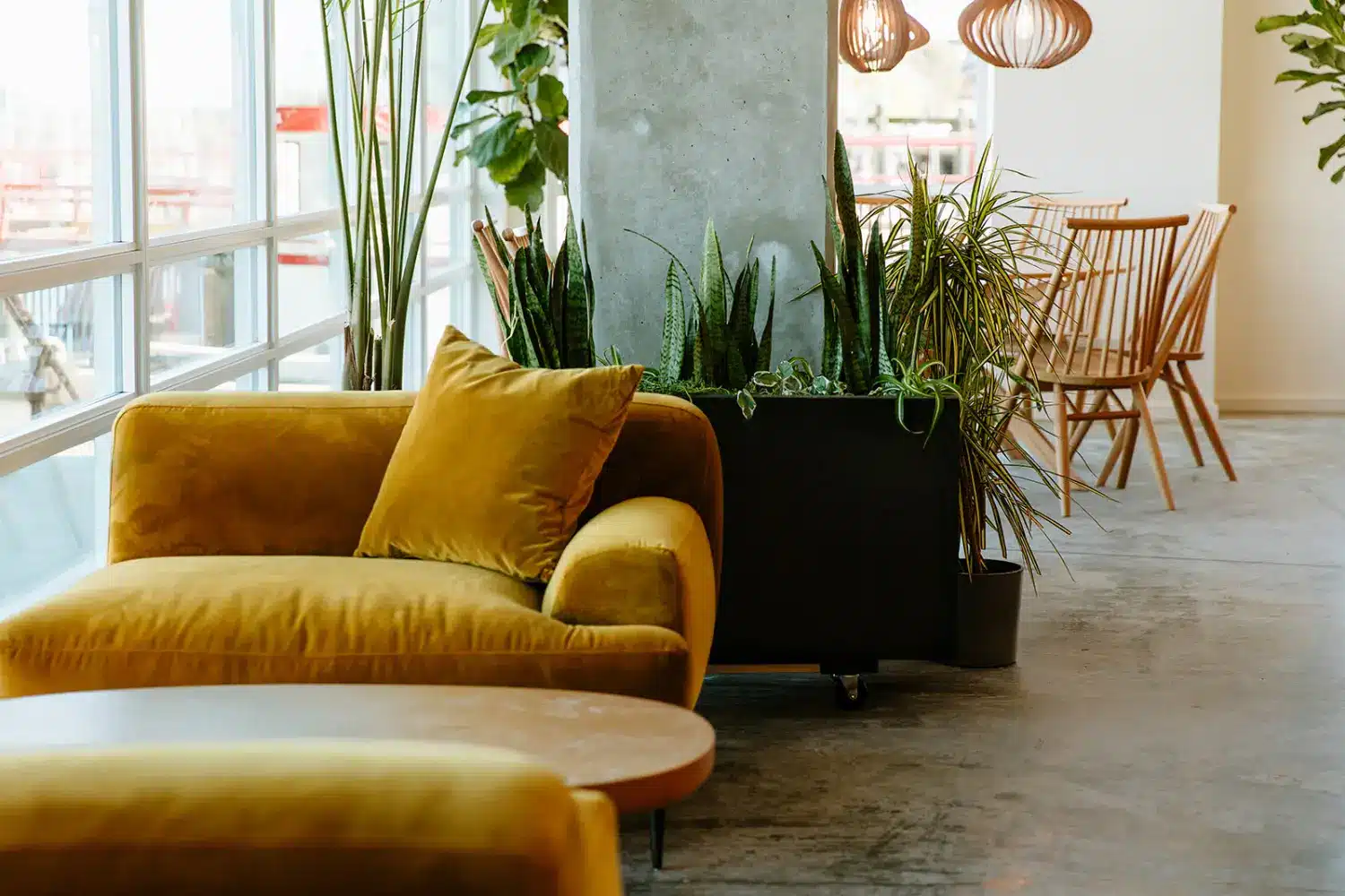 This space features a modern, biophilic design with abundant natural light, wooden furniture, and greenery. The open layout creates a welcoming ambiance, while warm lighting and natural textures promote relaxation. The use of plants adds vitality, blending functionality with aesthetics.